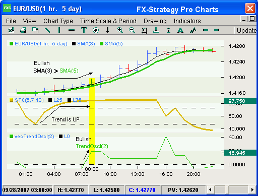 Chart 2. A Buy Entry occurs at 1.4186, at 8:00, when all three strategy indicators became bullish.